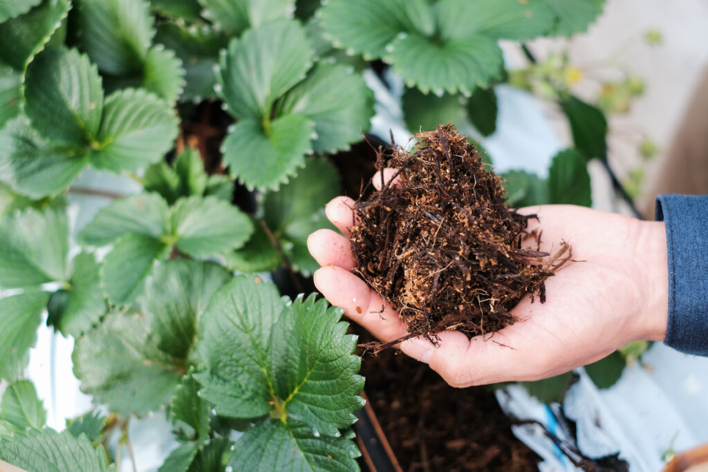特徴としては、自社の事業の1つである木材加工の過程で生まれる木くずや樹皮を培土に活用するなど、資源を循環させながら栽培しています。
